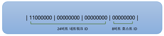 C 클래스는 처음 24비트가 네트워크 ID고 다음 8비트가 호스트 ID이다.