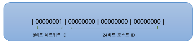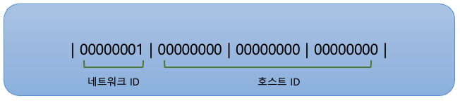 일반 네트워크에서는 A~C 클래스까지 사용할 수 있다. A 클래스는 처음 8비트가 네트워크 ID고 다음 24비트가 호스트 ID이다.