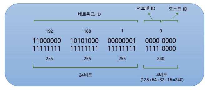 C 클래스이므로 일반적으로 네트워크 ID가 24비트지만 다음과 같이 네트워크 ID를 28비트로 변경하면 4비트를 호스트 ID에서 빌리게 되는 것이다. 즉, 네트워크 ID가 24비트, 서브넷 ID가 4비트, 호스트 ID가 4비트가 된다.