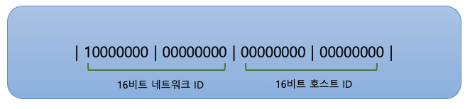 B 클래스는 처음 16비트가 네트워크 ID고 다음 16비트가 호스트 ID이다.