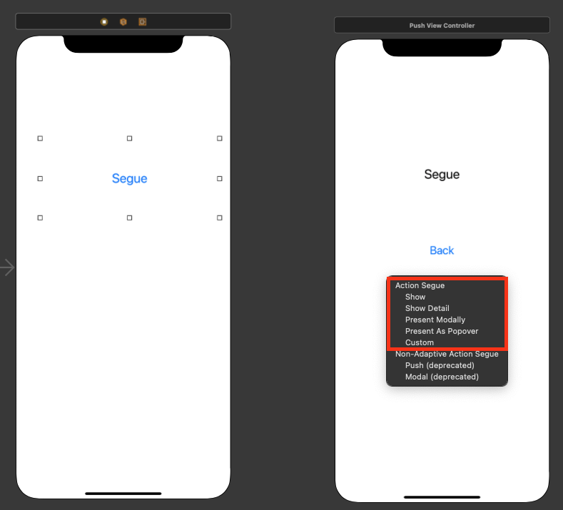 Segueway의 종류는 두 가지로 Action Segueway와 Manual Segueway가 존재한다.