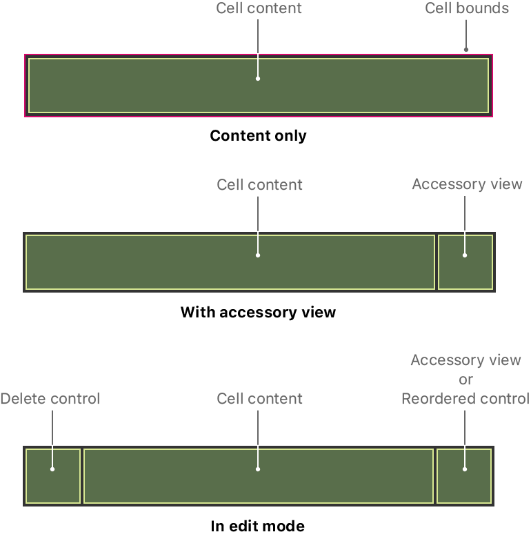 앱의 컨텐츠가 셀의 bounds를 대부분 차지하지만, 다른 컨텐츠를 저장할 공간을 만들기 위해 그 공간을 조정할 수 있다. 셀은 내용 영역의 맨 뒤에 있는 모서리에 액세서리 뷰를 표시한다. 테이블을 편집 모드로 전환하면 셀은 내용 영역의 맨 앞에 삭제 컨트롤을 추가하고 선택적으로 순서 변경을 위해 액세서리 뷰를 바꾼다.