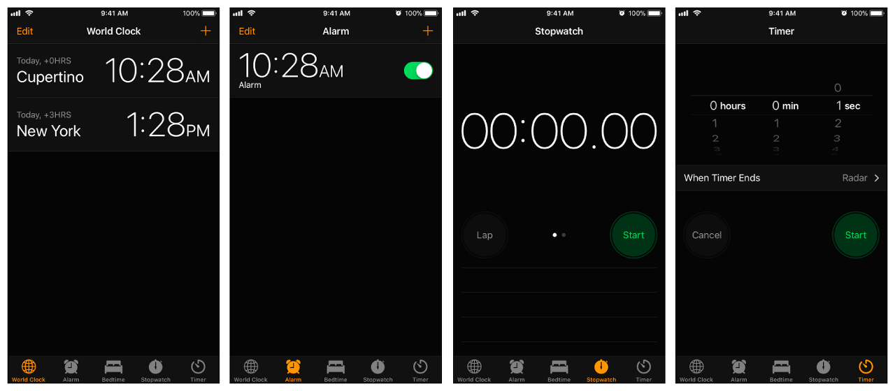 tab bar 인터페이스는 화면의 하단에 탭을 표시하여 서로 다른 모드를 선택하고 선택된 모드에 대한 뷰를 화면에 표시한다. 각 탭은 사용자 지정 뷰 컨트롤러와 연결된다. 사용자가 특정 탭을 선택하면 tabBarController는 해당 뷰 컨트롤러의 root view를 화면에 표시하여 이전 뷰를 대체한다(사용자 탭은 이전에 선택한 탭에 관계없이 항상 탭의 root view를 표시한다. 이는 탭을 이미 선택한 경우에도 마찬가지다.). 아래의 사진은 UITabBarController를 사용한 예시다.