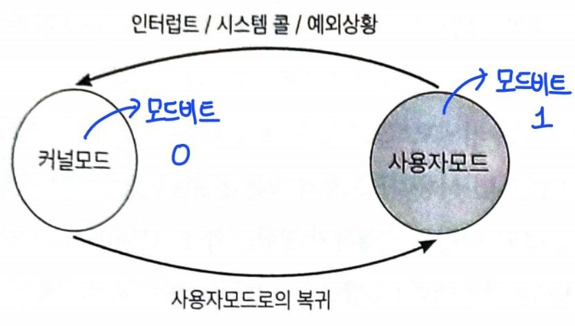 - 모드비트가 0이면 커널모드, 모드비트가 1이면 사용자 모드이다.