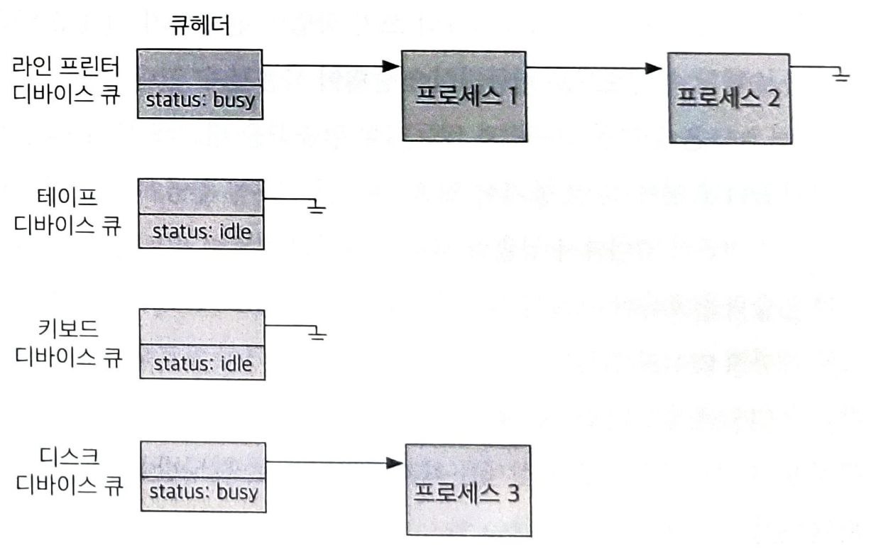 - 이럴 경우 동기성(synchronization)을 보장하기 위해 장치마다 큐를 두어 요청된 순서대로 처리할 수 있도록 한다.