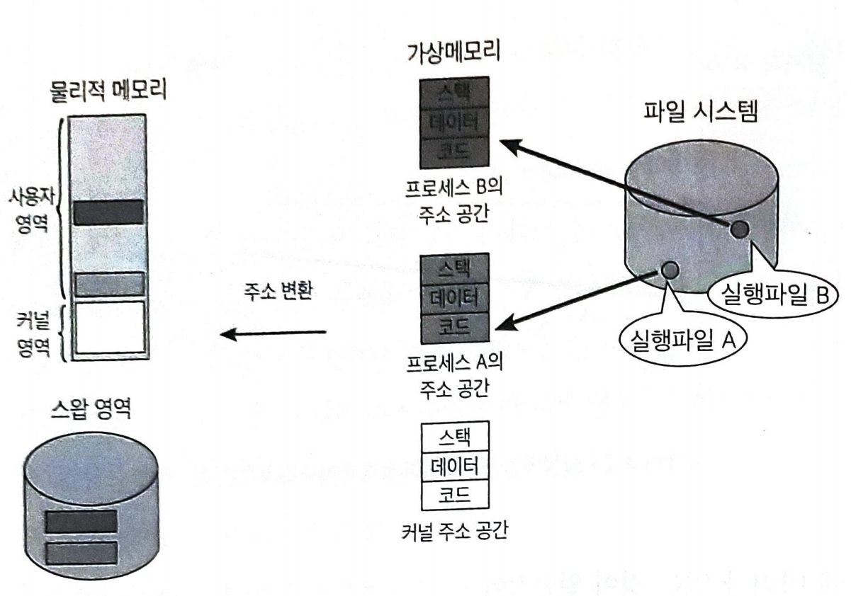 실행파일이 메모리에 적재될 때, 당장 수행에 필요한 부분은 메모리에 올라가고 나머지는 디스크의 스왑 영역에 내려가 있는 것이 일반적이다. 이는 적은 메모리 공간을 좀 더 효율적으로 사용하기 위한 방법이다.