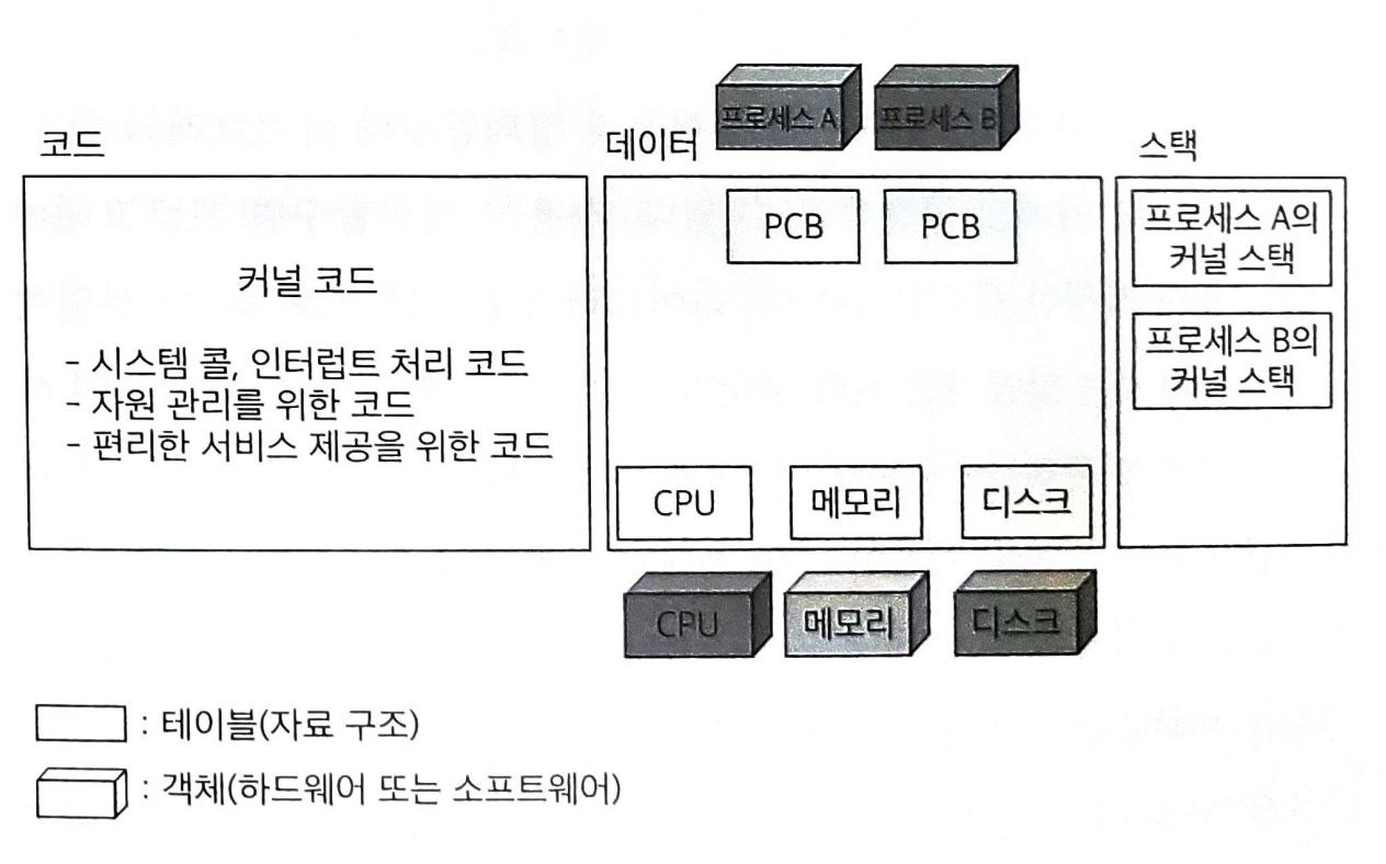 운영체제의 커널 역시 코드, 데이터, 스택의 주소 공간을 갖고 있다. 운영체제의 기능은 아랫단의 하드웨어 자원을 효율적으로 관리하는 것과 윗단의 응용프로그램 및 사용자에게 편리한 서비스를 제공하는 것이다. 이를 위해 커널의 코드는 CPU, 메모리 등의 자원을 관리하기 위한 부분과 사용자에게 편리한 인터페이스를 제공하기 위한 부분이 주를 이루고 있다. 이 외에도 시스템 콜 및 인터럽트를 처리하기 위한 부분을 포함한다.