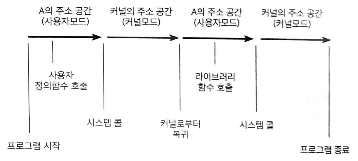 위와 같은 함수들은 운영체제 커널의 주소 공간에 코드가 정의된다. 일반적인 함수 호출은 사용자 프로그램 내에 존재하는 코드를 실행하는 것이고 커널 함수는 운영체제라는 별개의 프로그램에 CPU를 넘겨서 실행하는 것이다.