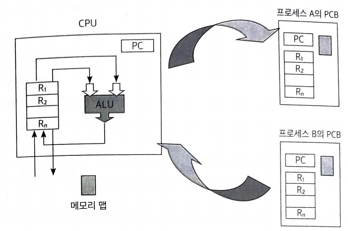 - A 프로세스는 프로그램 카운터 값 등 프로세스의 문맥을 자신의 PCB에 저장하고, B 프로세스는 예전에 저장했던 자신의 문맥을 PCB로부터 실제 하드웨어로 복원시키는 과정을 거친다.