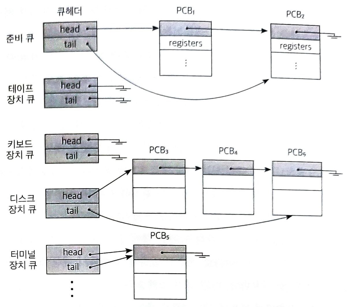 큐헤더(queue header)는 큐의 가장 앞부분을 뜻한다. 큐는 각 프로세스의 PCB를 연결 리스트 형태로 관리하며 포인터를 사용해 순서를 정한다. CPU를 할당받은 프로세스가 입출력 요청을 발생시키면 해당 장치 큐에 가서 줄을 서고 봉쇄 상태로 바뀐다. 봉쇄 상태에 있다가 해당 장치의 서비스를 받고 나서 장치 컨트롤러가 인터럽트를 발생시키면 준비 상태로 바뀌어 준비 큐로 이동하게 된다.