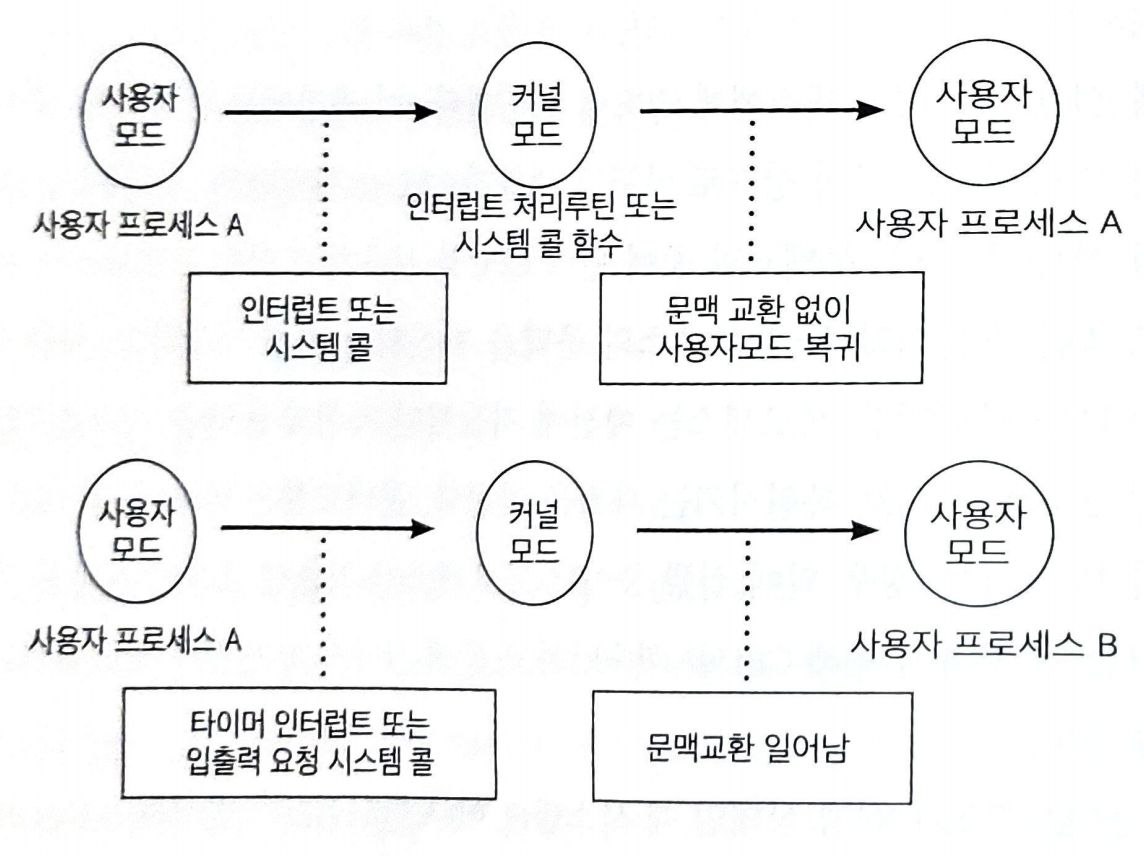 타이머 인터럽트가 발생하거나 프로세스가 입출력 요청 시스템 콜을 하여 봉쇄 상태에 들어가는 경우에는 문맥교환이 일어나지만, 그 밖의 인터럽트나 시스템 콜 발생 시에는 문맥교환이 일어나지 않고 실행 모드만이 변경될 뿐이다.