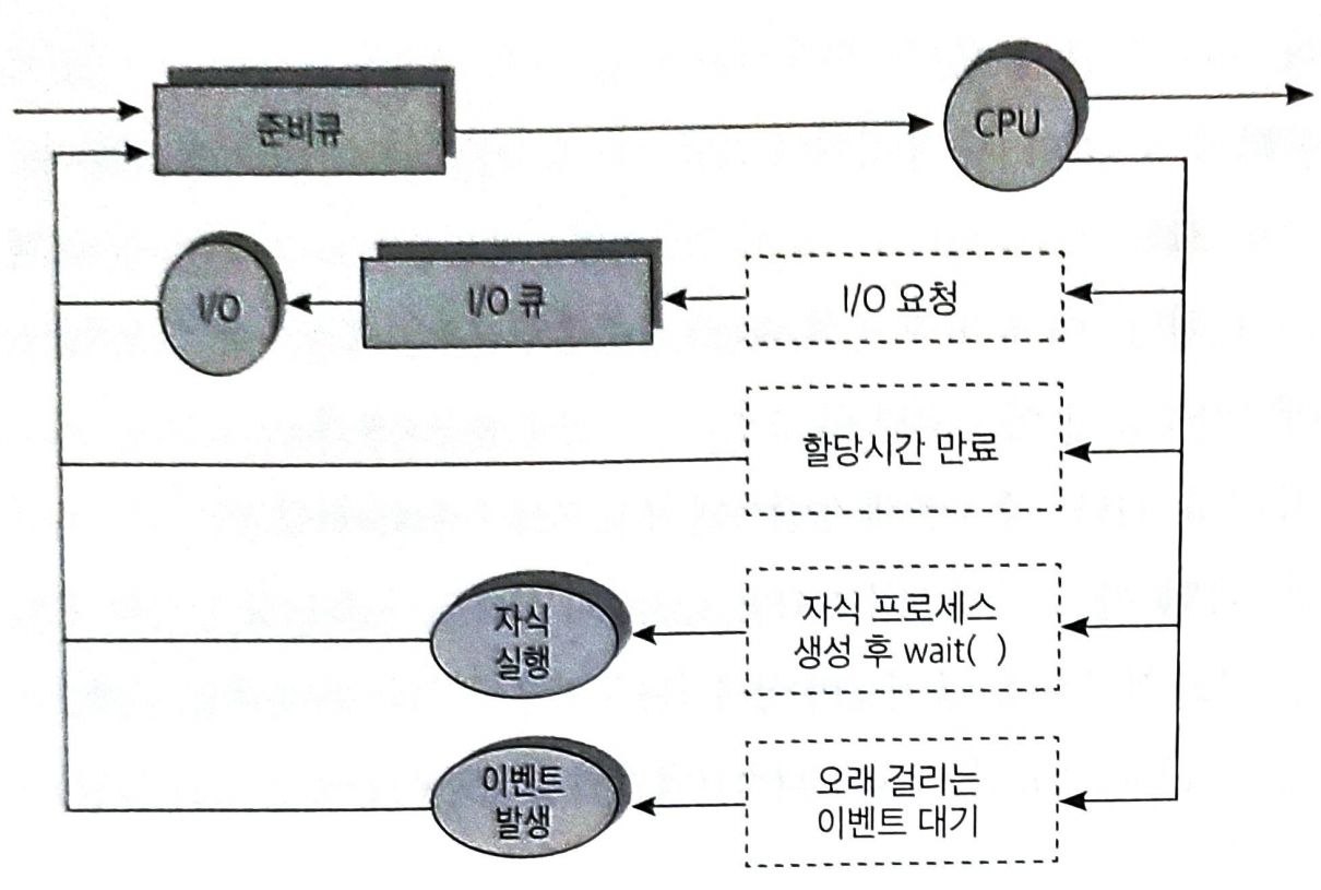 운영체제는 준비 큐 외에도 특정 자원을 기다리는 프로세스들을 줄 세우기 위해 자원별로 장치 큐(device queue)를 둔다. 위의 그림처럼 디스크 입출력 서비스가 필요한 프로세스들은 디스크 입출력 큐에 줄을 선다. 디스크 컨트롤러는 순서대로 프로세스들의 입출력 작업을 수행하고 작업이 완료되면 CPU에게 인터럽트를 발생시키게 되고, 디스크 입출력이 완료된 프로세스는 입출력 큐에서 빠져나와 CPU를 기다리는 준비 큐에 줄 서게 된다.