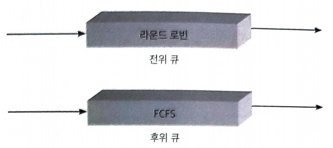 - 전위 큐와 후위 큐를 사용할 경우, 전위 큐에게 우선적으로 CPU가 할당되고, 전위 큐가 비어 있는 경우에만 후위 큐에 CPU가 할당된다.