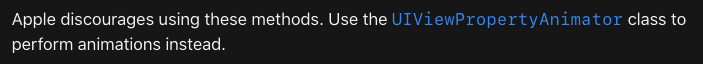 애플 공식문서에는 위와 같이 사용을 지양하고 UIViewPropertyAnimator를 대신 사용하라고 나와있다. 추후에 deprecated 될 수도 있을 것 같다.