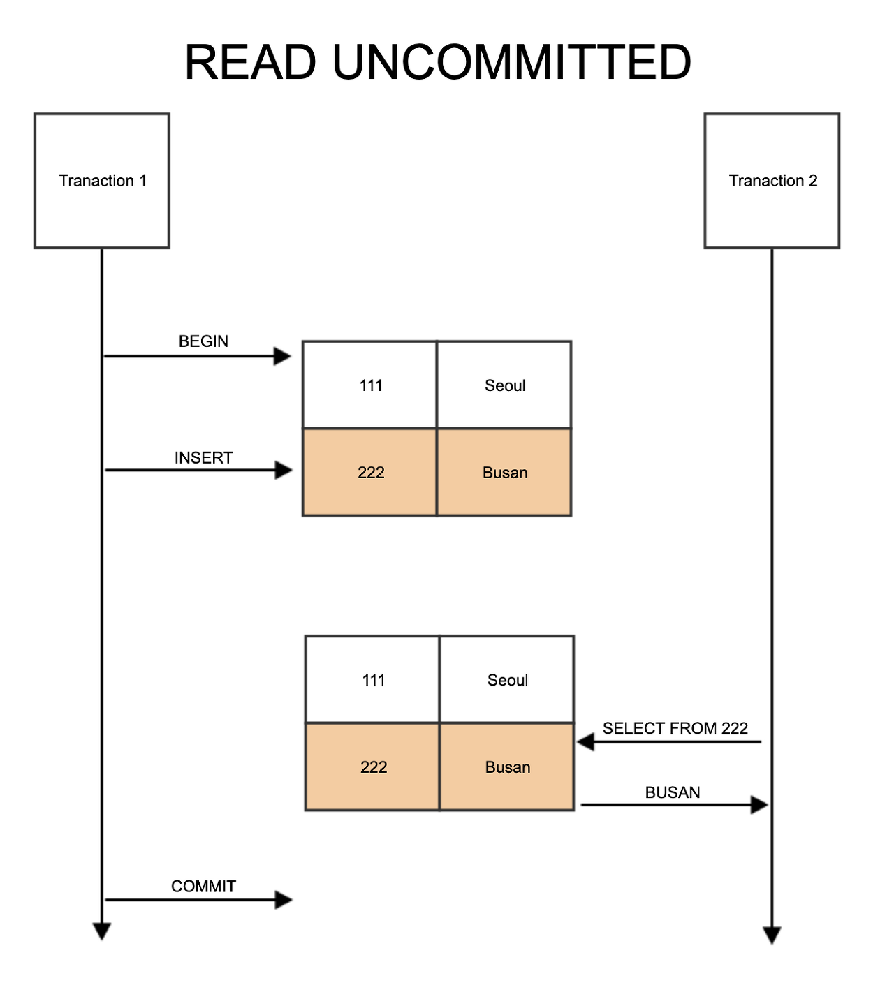 위의 예제에서 Transaction2가 222에 대한 값을 조회했을 때 Busan이라는 값을 가져왔다. 하지만 Transaction1이 Commit된 후 다시 한 번 222에 대한 값을 조회하면 Jeju라는 값을 가져오게 된다. 하나의 트랜잭션 안에서 같은 222에 대해서 조회했지만 한 번은 Busan을 가져왔고 다른 한 번은 Jeju를 가져와 정합성에 어긋나게 된다.