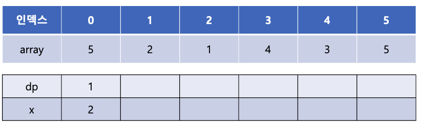 이는 길이가 1인 증가 부분 수열이 {5}와 {2}가 있는데 이 수열 중에서 끝 값이 더 작은 2를 x 배열에 저장해 놓는다는 의미이다.