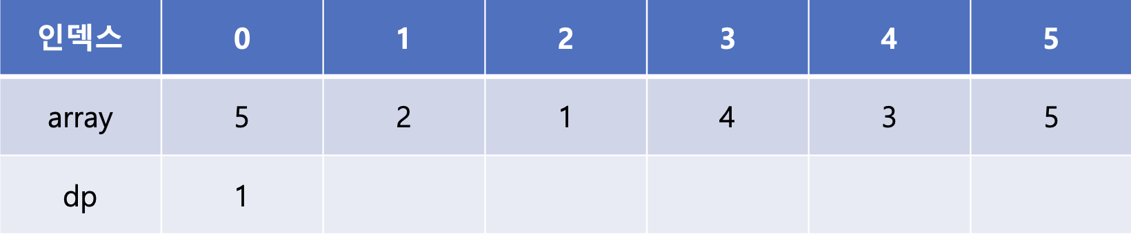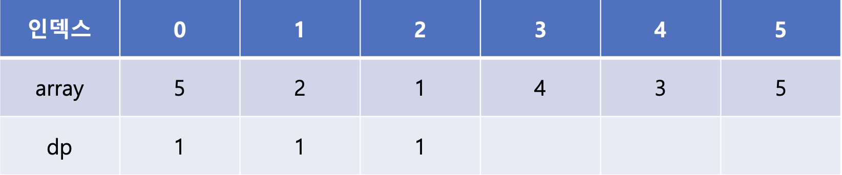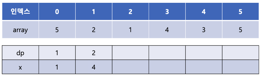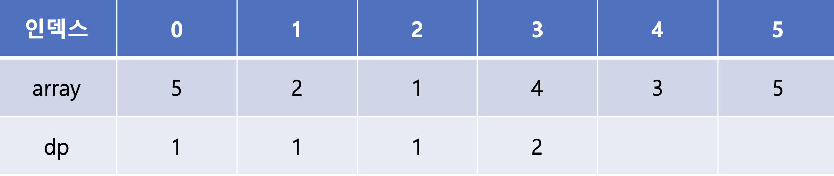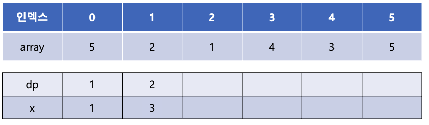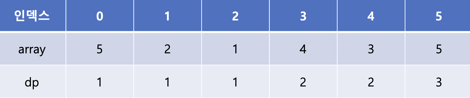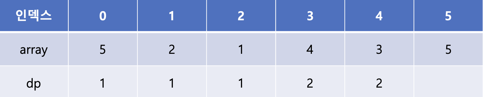 마지막 array[5]는 array[1], array[2], array[3], array[4]에 비해 큰 값이다. 이 중 dp[3]과 dp[4]가 2로 가장 큰 값이므로 dp[5]에는 2 + 1인 3이 들어가게 된다.