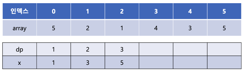 마지막으로 array[5]의 값인 5를 x 배열의 몇 번째에 넣을 수 있는지를 이분탐색을 통해 찾는다. x 배열의 마지막 값인 3보다 크므로 x 배열에 새롭게 5를 추가해 주고 dp 배열에는 dp 배열의 마지막 값에 + 1을 해주어 3을 추가해준다.