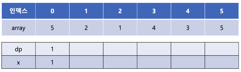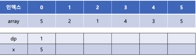 위의 예제를 이분 탐색을 사용하여 LIS의 길이를 구해보자. 처음에는 dp[0]에 1을 넣어주고 x[0]에는 array의 첫 번째 값인 5를 넣어준다.