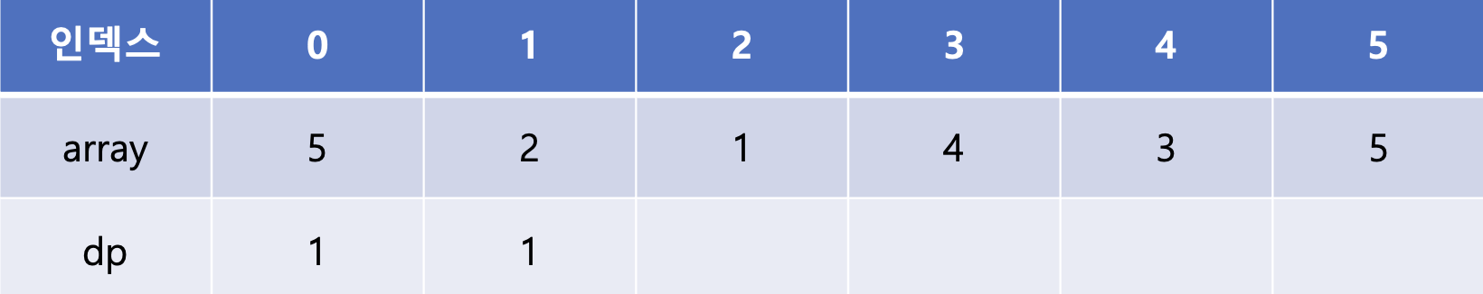array[2] 역시 앞의 array 값들과 비교했을 때 작으므로 dp[2]에는 1이 들어간다.