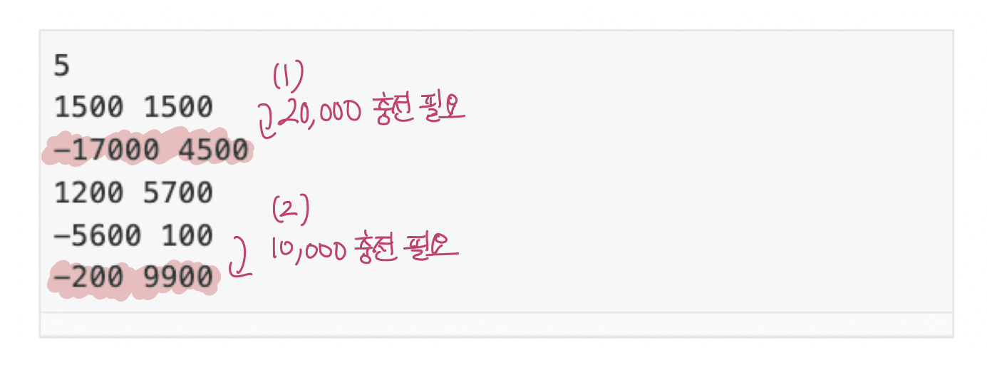 문제의 예제에서 충전이 필요한 출금 작업은 두 건 존재한다.