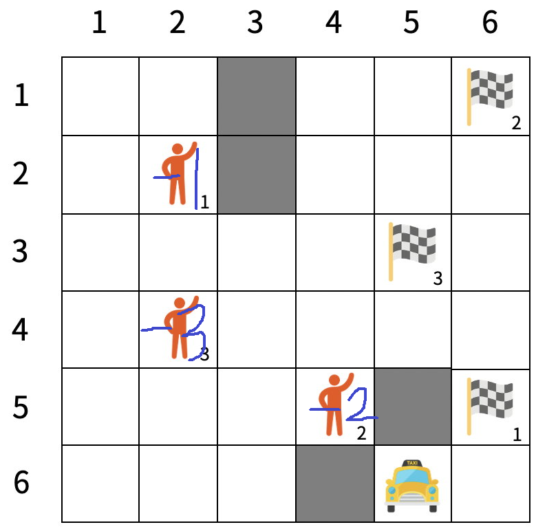 - 최단 거리가 같은 승객이 여러 명이면 행 번호가 가장 작은 승객