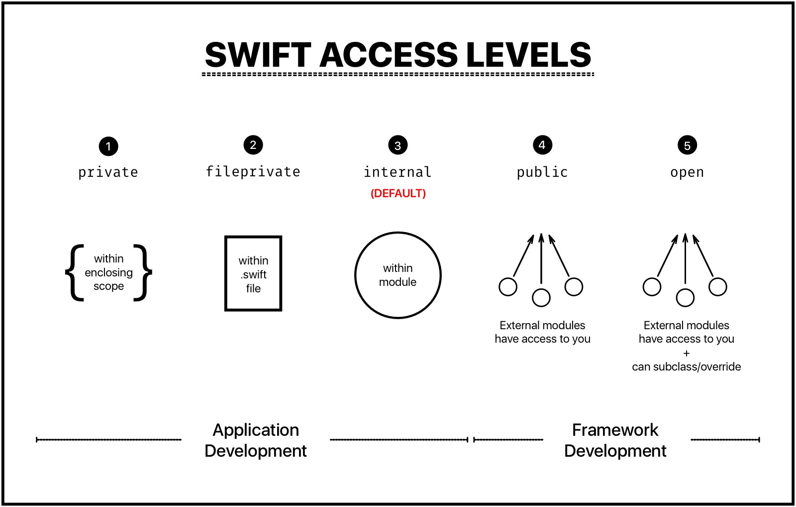 접근제어는 접근수준 키워드를 통해 구현할 수 있다. 각 타입(클래스, 구조체, 열거형 등)에 특정 접근수준을 지정할 수 있고, 타입 내부의 프로퍼티, 메서드, 이니셜라이저, 서브스크립트 각각에도 접근수준을 지정할 수 있다. 접근수준을 명시할 수 있는 키워드는 open, public, internal, fileprivate, private 다섯 가지가 있다.