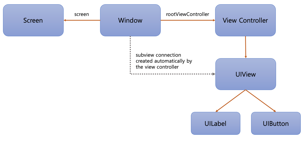 위 그림에서는 뷰 컨트롤러가 빠져 있다. 사실 뷰 컨트롤러는 화면을 그려내는 데에 반드시 필요한 요소는 아니다. MVC 패턴을 사용하는데 있어서 사용되는 컨트롤러 객체라고 볼 수 있다. 뷰 컨트롤러는 뷰와 리소스를 관리하는 역할을 해야 하고 각 역할에 대한 내용은 모두 UIViewController 클래스에 정의되어 있다. 따라서 모든 뷰 컨트롤러는 UIViewController 클래스를 상속받아야 한다.