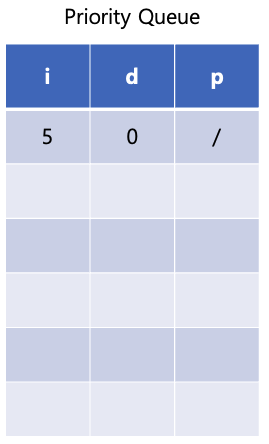 위 표에서 i는 정점 인덱스, d는 최단 거리이고 p는 이전 정점이다. d를 기준으로 최소 힙으로 구성한다.