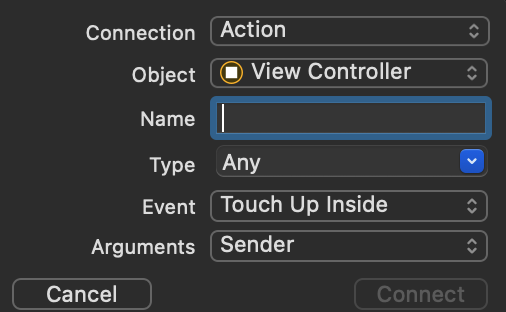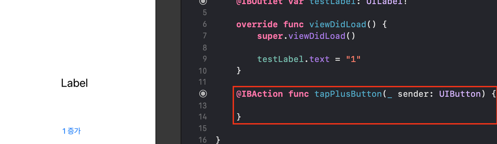 적절한 이름을 입력하고 Connect 버튼을 누르면 아래와 같이 @IBAction 어노테이션이 적힌 메소드가 추가되는 것을 볼 수 있다.