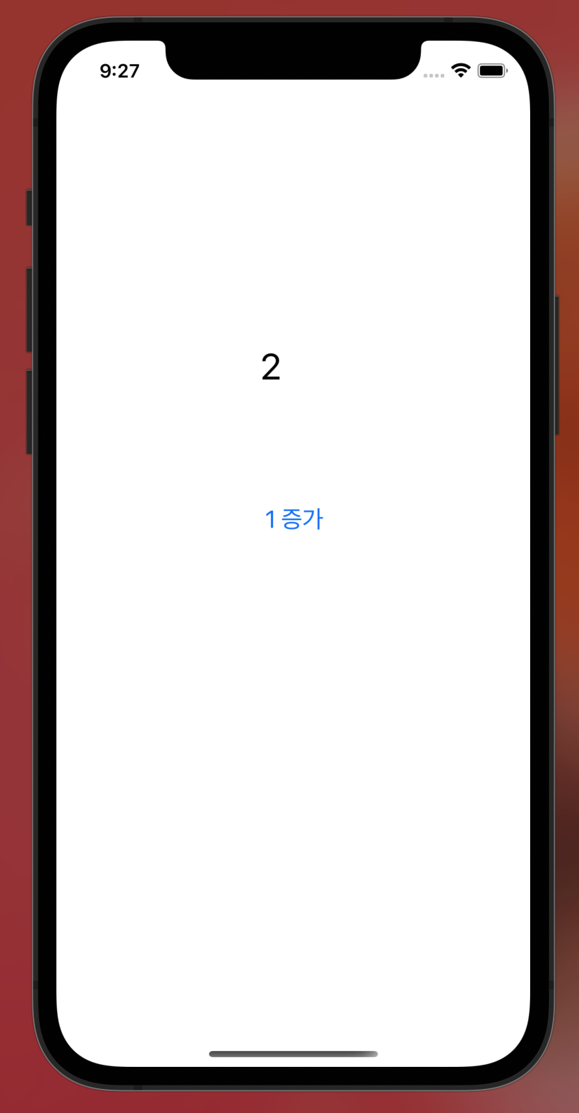 "1 증가" 버튼을 누르면 위의 메소드가 실행 된다. testLabel을 1 증가시키는 로직을 안에 작성해 주면 된다. 프로젝트를 빌드하고 앱을 실행한 후 버튼을 누르면 아래와 같이 testLabel의 값이 1 증가하는 것을 볼 수 있다.
