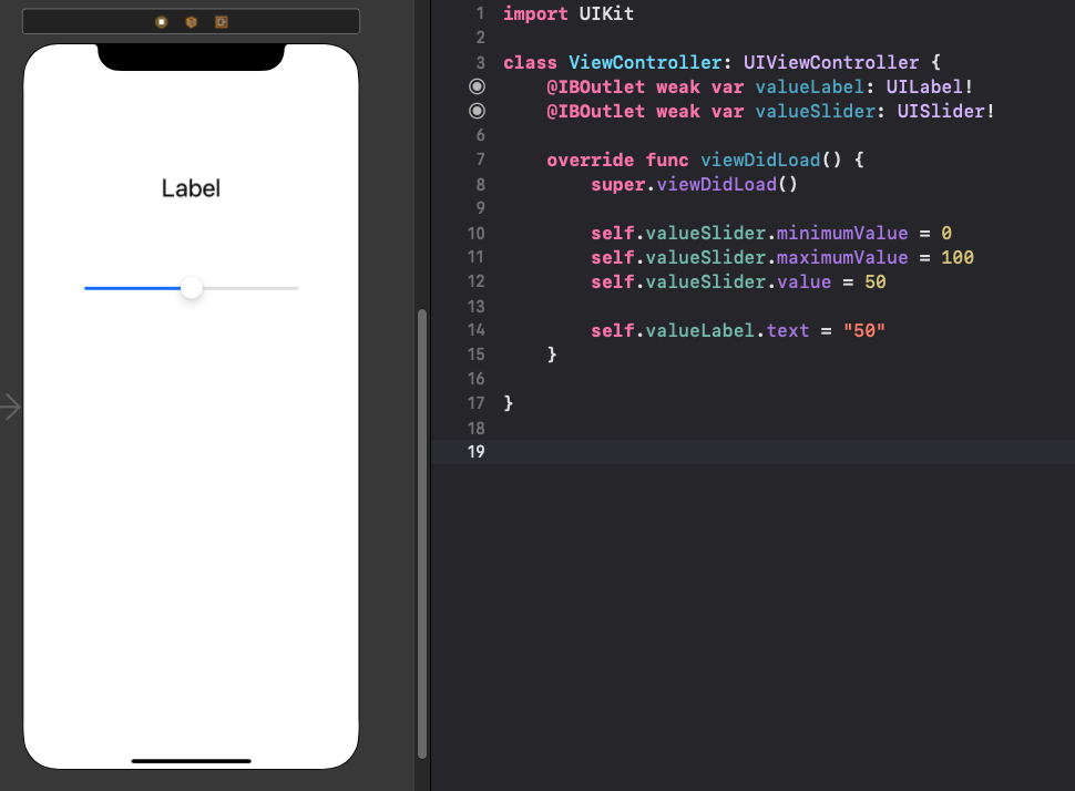 위의 사진처럼 슬라이더(valueSlider)와 Label(valueLabel)을 하나 만들어서 코드와 연결시켜줬다. 그리고 앱이 실행될 때 슬라이더의 최소값, 최대값, 현재 값을 설정해줬고 Label의 텍스트 값은 현재 슬라이더의 값인 "50"으로 설정해줬다.